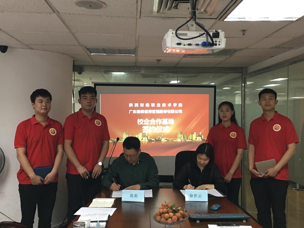 5月16日,我院在广州与广东德律信用管理股份有限公司签署合作协议,共同为校企合作基地揭牌。广东德律信用管理股份有限公司董事长徐作云、总经理徐作霞,学院副院长范忠,经济与金融学院院长景海萍、副院长陈冬、有关工作人员和学生代表参加了签约揭牌仪式。
