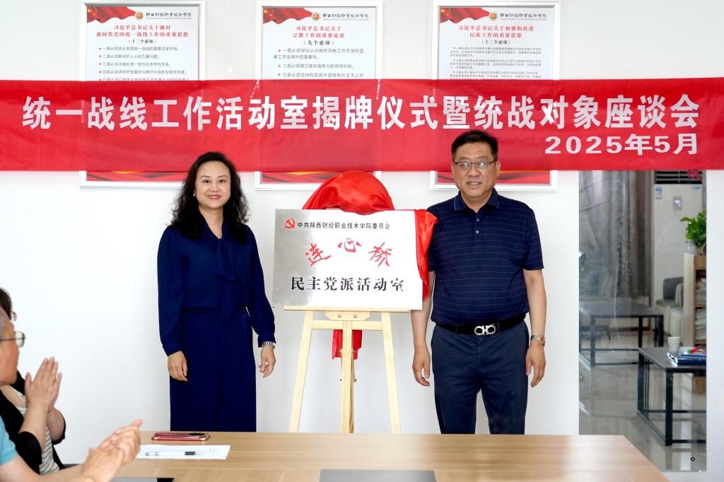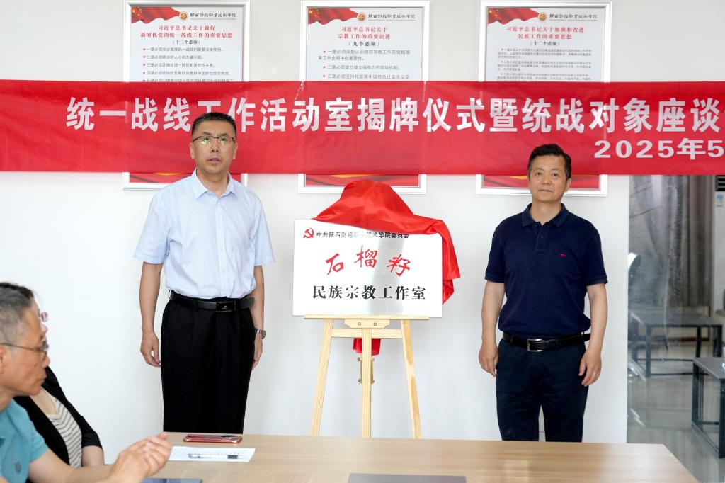 揭牌仪式上,党委书记高玉峰,市政协委员、民建会员、我校会计学院院长常茹共同为“连心桥”民主党派活动室揭牌,党委副书记朱华斌,党委委员、党委统战部部长穆天楠共同为“石榴籽”民族宗教工作室揭牌。