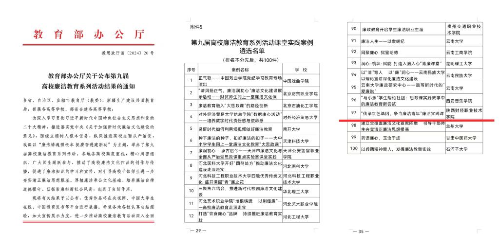 近日,教育部公布了《关于第九届全国高校廉洁教育系列活动结果的通知》,我校申报的“传承红色基因,争当廉洁青年”廉洁实践课项目荣获第九届全国高校廉洁教育系列活动课堂实践优秀案例,陕西省高校共有18件作品入选,全省高职院校仅有4件作品,我校位列其中。