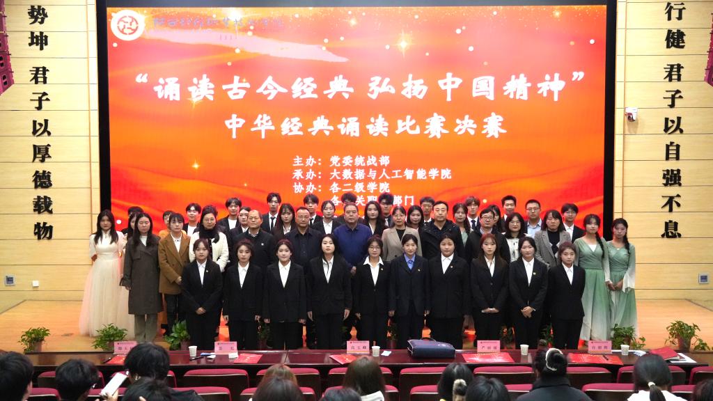 为进一步深化民族团结进步教育、厚植爱国情怀,传承和弘扬中华传统文化,增强民族自信心和自豪感。由学校党委统战部主办、大数据与人工智能学院承办、各二级学院、各相关职能部门协办的“诵读古今经典 弘扬中国精神”中华经典诵读比赛决赛于2024年11月14日下午在学术报告厅成功举办。