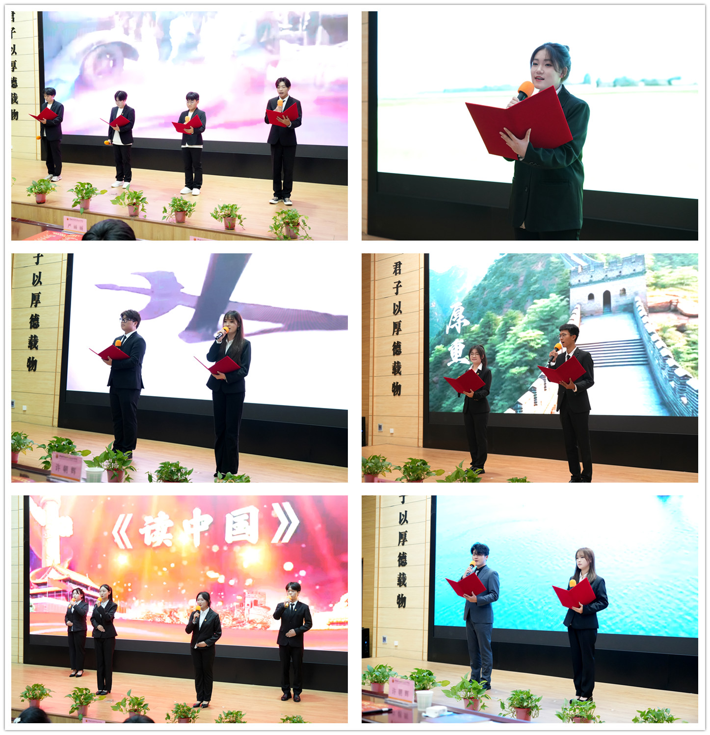 比赛在精彩的开场舞《小春瑶》中拉开序幕,轻盈优美的舞姿营造出了如梦如幻的氛围。比赛中,选手们紧紧围绕“诵读古今经典 弘扬中国精神”主题,以饱满的热情和生动的语言,带领师生们在经典诵读中感受中华语言文字的博大精深和字里行间的无穷魅力,尽情抒发着青年学子对党、对人民、对祖国的热爱之情。