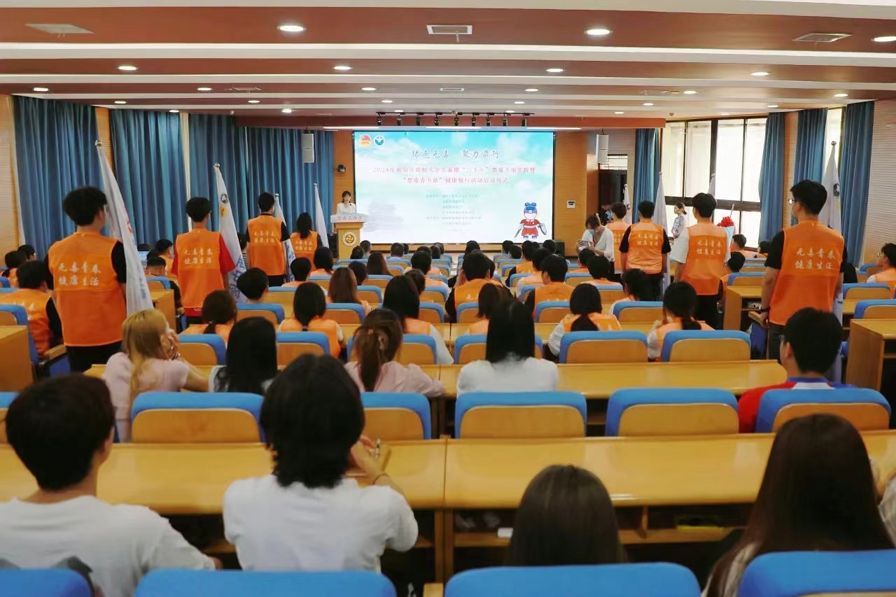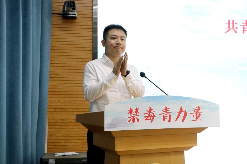 朱华斌在致辞中表示我校将继续提升广大青年学生防毒禁毒意识,筑牢禁毒阵地、守护校园净土。同时向广大青年学子提出几点希望:一是希望同学们做禁毒知识的宣传者,创新禁毒教育宣传方式,提高广大学生识毒、防毒、拒毒的意识和能力;二是希望同学们做禁毒理念的践行者,树立“健康人生、绿色无毒”的生活理念,筑牢“珍爱生命、远离毒品”的思想防线;三是希望同学们做禁毒工作的参与者,积极投身禁毒公益事业,争做扛起禁毒大旗的志愿者、领头人,为推进“无毒校园”建设贡献青春力量。