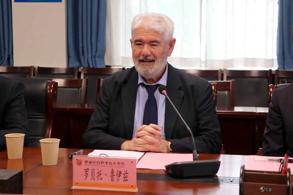 王勇首先代表学校对罗贝托·鲁伊兹一行的到访表示热烈的欢迎,并介绍了我校的基本情况以及国际化办学情况。他谈到,学校坚持“开门办学、开放办学和国际化办学”的开办思路,主动对接“一带一路”教育建设,孕育出具有陕财特色的“一院一坊”国际化办学案例,着力开创我校国际化办学和高水平建设发展。他表示,学校非常重视与国外高等院校的国际交流与合作,期望与大西洋欧洲大学建立起合作关系,坚持双方优势互补,在专业共建、标准共定、师资培养、学生交流、资源共享等方面开展交流和合作,促进双方共同发展。