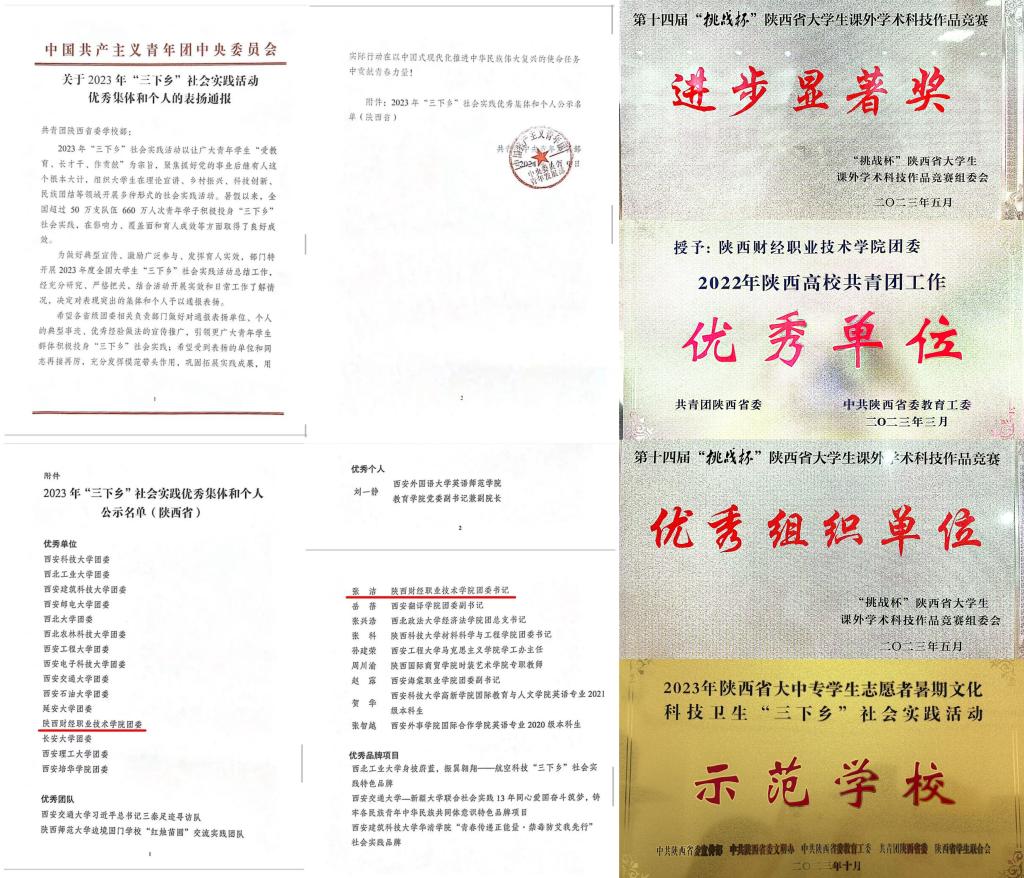 荣获全国“三下乡”社会实践优秀单位,“陕西高校共青团工作优秀单位”“挑战杯”竞赛“优秀组织单位”“进步显著奖”等国省市级以上集体荣誉24项、个人荣誉23项。
