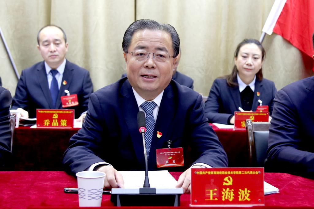 王海波代表省委教育工委、省教育厅向大会的召开表示热烈的祝贺,向学校全体共产党员和全校师生致以崇高的敬意和亲切的问候。他高度肯定了学校第一次党代会以来,不断加强党的建设,紧抓职业教育发展机遇,围绕“双高计划”建设,大力加强人才队伍建设,狠抓人才培养模式改革,不断深化产教融合,办学条件明显改善,育人成效不断提升。希望大家认真履行代表职责,选举产生“信念坚定、为民服务、勤政务实、勇于担当、清正廉洁”新一届党委、纪委领导集体,并向新一届党委和纪委提出四点要求:一要始终坚持政治建设为统领,不断坚持和加强党对学校的全面领导;二要认真落实立德树人根本任务,努力培养担当民族复兴大任的时代新人;三要全力推进高质量内涵式发展,持续提高对地方和行业的服务支撑能力;四要坚持从严管党治党,切实营造风清气正的政治生态。