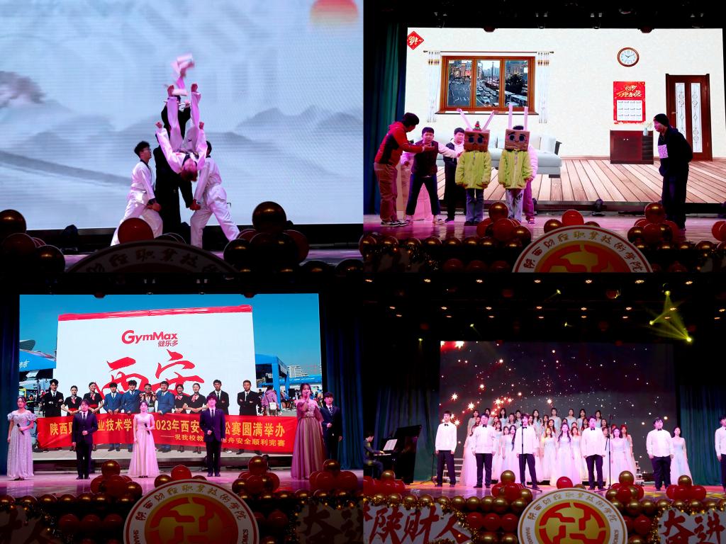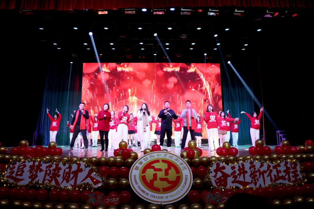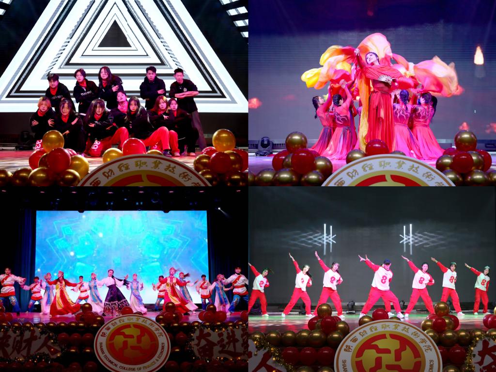 今年我校与全省一百多所中职院校签订了“中高职贯通”联合培养协议,来自延长县职业教育中心的同学们也来到了晚会现场,他们精彩演绎的舞台剧《让梦想从这里启航》和诗朗诵《百年交响》,展现了青年一代的远大理想,蓬勃力量,用诗歌唤起观众深藏于心底的红色记忆,让全场重温永不褪色的经典颂歌。人文艺术学院的舞蹈《向黎明进发》红扇飞舞,犹如百年前那一艘小小的红船,承载着人民的希望,燃烧成燎原的火焰。郭珊珊老师带来的《春风十万里》唱出了华夏大地日新月异的变化,唱出了对祖国和人民的深情祝愿。由校广播站带来的诗朗诵《陕财追梦人》激情澎湃,展现了我校学子积极向上、不怕吃苦、奉献社会的新时代青年的风貌与担当。运动与健康管理学院的《Midon》诠释了排舞与街舞的健康活力,现代舞蹈队的《舞蹈串烧》激情四射,点燃了现场气氛,他们用舞姿演绎了激情与自信,跳出了青春与活力。小品《元旦的诱惑》大数据与人工智能学院学生们的精彩表演令全场师生捧腹不已,笑声不断。晚会在教师团干连静、张璐、马朝、张欣瑞、张静瑜、刘明、李盼以及会计学院学生代表共同演唱的《相亲相爱》中落下了帷幕。