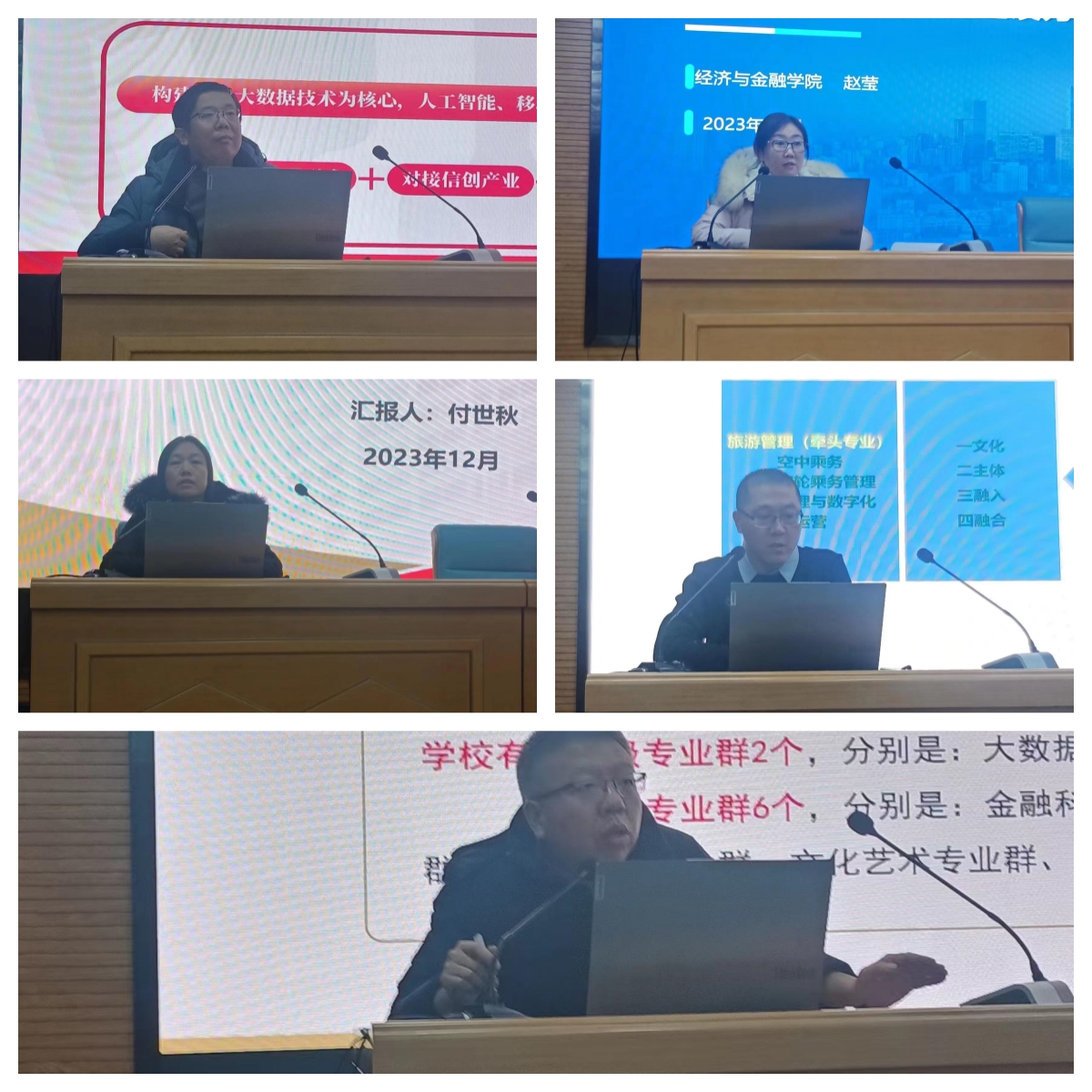 会议第二阶段,教务处副处长李福顺汇报了学校专业群建设现状和思路,大数据与人工智能学院院长王双明、经金学院工程管理系主任赵莹、人文艺术学院院长付世秋、数字商务学院旅游服务系主任丁小伟分别代表大数据技术与应用专业群、工程造价专业群、工艺美术品设计专业群和旅游管理专业群四个新建专业群进行了汇报。