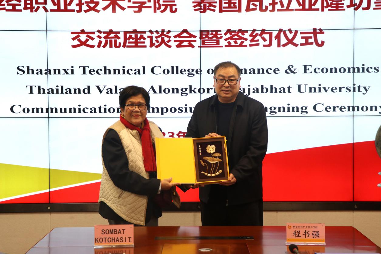 为进一步提升合作的深度、广度和宽度,我校与泰国瓦拉亚隆功皇家大学签订了战略合作协议。同时,程书强代表我校向泰国瓦拉亚隆功皇家大学校长桑巴特·科查西赠送我校纪念品——麦秆画。