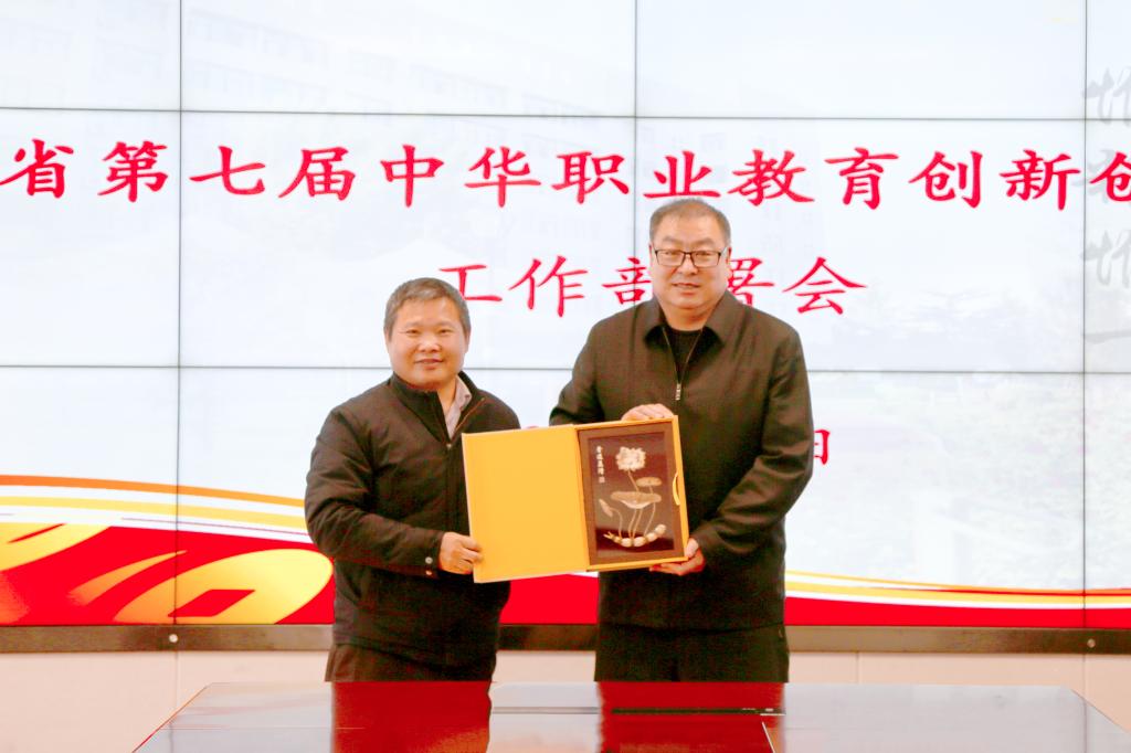 程书强代表学校向陕西省中华职业教育社赠送我校师生麦秆画作品《香远益清》。
