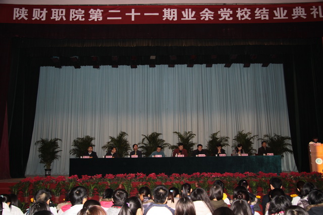 12月8日下午,我院第21期业余党校结业典礼在大礼堂隆重举行。出席典礼的有院党委副书记兼纪委书记刘文雅,学工部副部长王铁练、宋波,宣传处副处长朱永斌,信息工程系、会计系、工商管理系和财政税务系等四系党总支专职副书记郭宝东、陈红梅、陈志宏、崔斗。各支部确定的入党积极分子及发展对象1400余人参加了大会。会议由组织处穆天楠主持。