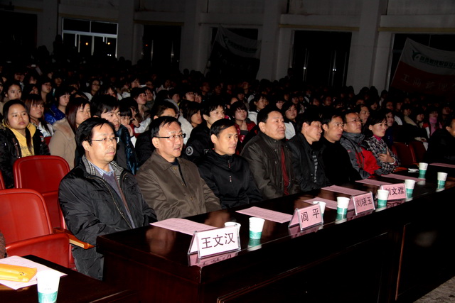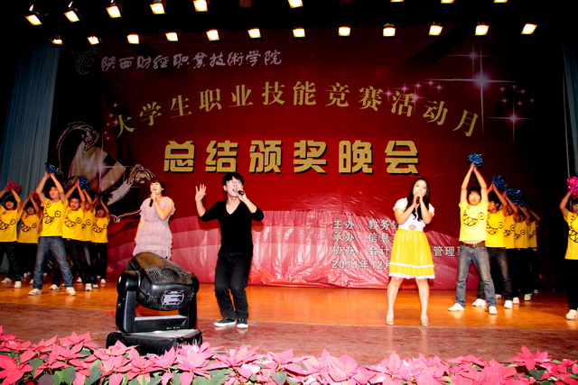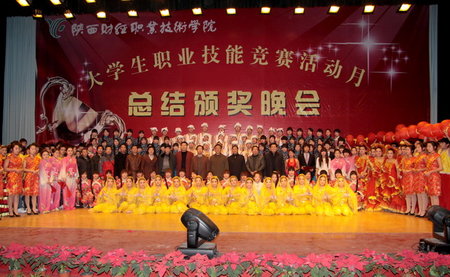 2011年12月8日晚7时30分,陕财职院2011大学生职业技能竞赛活动月总结颁奖晚会在学院大礼堂隆重举行。学院院长阎平老师,副院长刘晓玉老师,副院长王文汉老师,党委副书记兼纪委书记刘文雅老师,学院办公室、教务处、学工部、教育教学研究室、教学评估督导室和四个系部的有关领导、老师及各班级学生代表共1400余人出席了本次晚会。