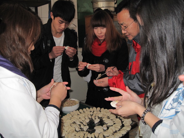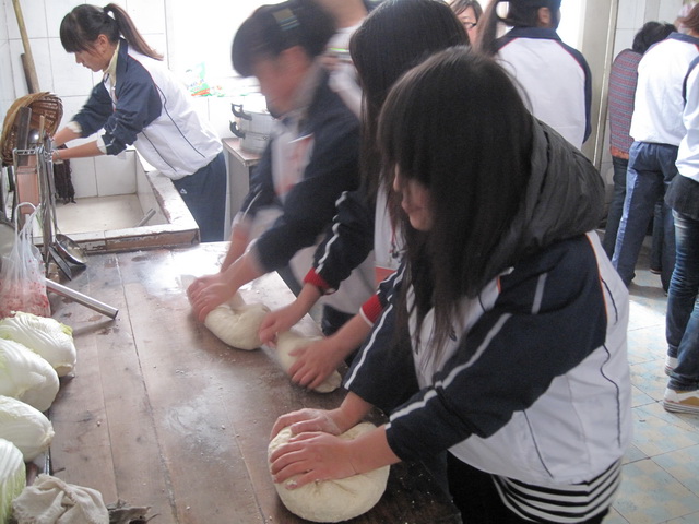 最忙的是厨房,十多名志愿者拿出自备的各种材料,争着做着各式各样的事情,有的摘菜,有的和面,有的剁肉,有的擀皮,还有的包饺子。同学们包的饺子各式各样,有的像元宝,有的像香包,有的像鱼形,有的像葵花,有的像馄饨,有的锁边,有的收口,扁平的、半圆的,应有尽有。同学们会包的教着不会的,相互欣赏并切磋着技艺,寒冷的厨房里洋溢着温暖的气息。两个多小时后,1300多个式样众多的饺子包好了,栗敏同学们开心地说,从来没有遇到过这么热闹的包饺子场面,看到同学们相互协作完成的这么多劳动成果,内心升腾起一股特殊的满足感。