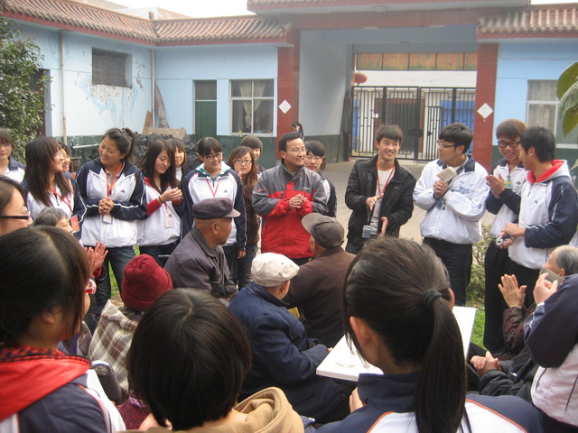 9时半,同学们开始在院子里表演起节目,有独唱、合唱、相声、华尔兹,老人们在同学们的陪护下坐在一起,欣赏节目,他们显得十分开心,不时鼓掌,69岁的吴玉兰老人流下了高兴的泪水。78岁的董玉兰老人被同学们的热情感染了,她主动要求也给同学们表演节目,她唱的是秦腔《赵五娘吃糠》、《红灯笼》和歌曲《社会主义好》,在唱《社会主义好》的时候,同学们不由自主的跟着她一起唱了起来,老人的独唱顿时变成了合唱,其情其景,感人至深。