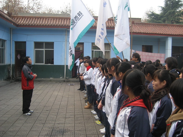 8:50,志愿者们打着院旗和志愿者旗帜,在学院一号教学楼前广场整齐列队,宋波老师作了动员讲话。