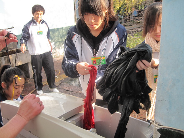 上午9时许,志愿者身着校服,带着胸牌,打着校旗,来到“夕阳红”托老中心,按照预先的分工,分头行动起来。劳动组的开始打扫庭院、整理内务;厨卫组的开始洗菜、剁肉、和面……;文娱组的开始做节目演出的各项准备工作;抚慰组的开始陪老人们聊天、捶背、梳头、剪指甲……