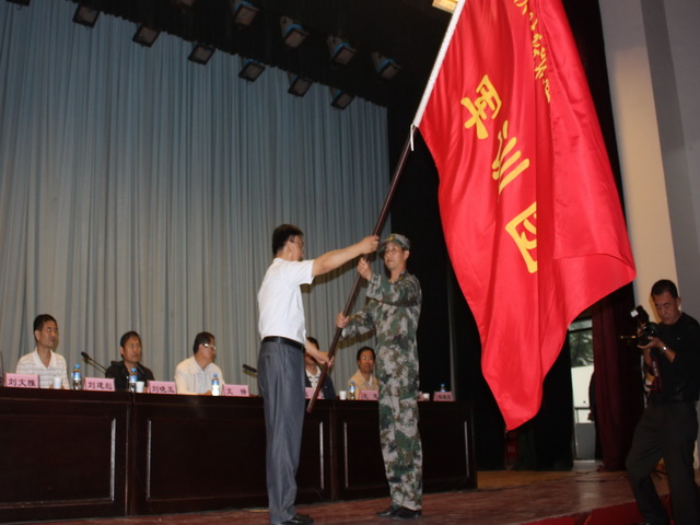 最后,阎平代表学院向军训团授旗,团旗在掌声中分外鲜艳。大会在雄壮的中国人民解放军军歌中结束。
