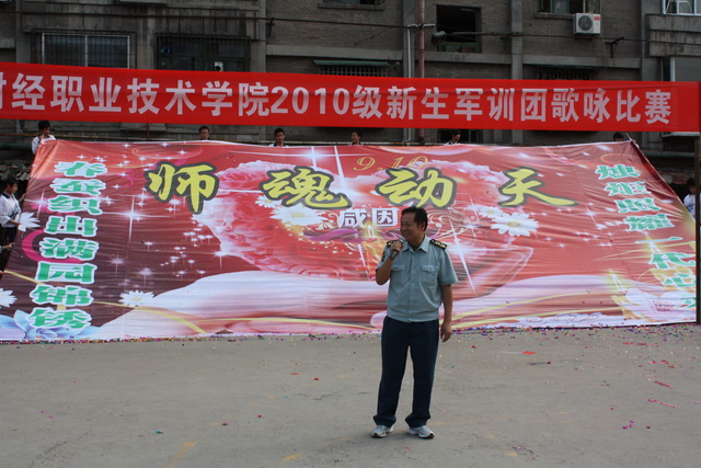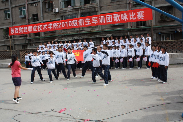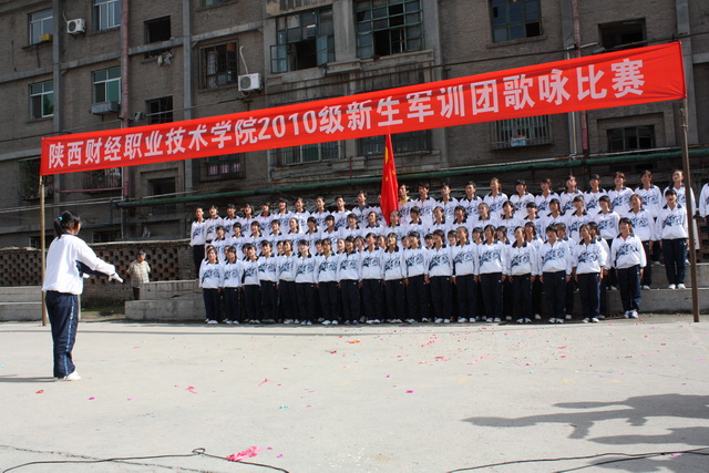 2010年9月10日下午三时,陕西财经职业技术学院南校区2010级新生军训歌咏比赛在南校区篮球场举行。信息工程系、会计系2010级近千名军训新生以连为单位(分为十个连队)进行了比赛,院学工部王铁练副部长、甘少华老师、张朴老师参与了本次活动。