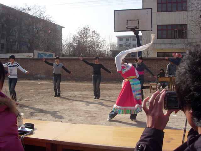下午2点,阳光洒满大地,操场上同学们欢聚一堂,联欢会正式开始了。冬天虽然寒冷,同学们的心却是热的,随着热烈的掌声由会电14班同学为大家带来的优美藏舞《吉祥瑶》出场了,伴着欢快的舞步和甜美的歌声,我们仿佛走进了美丽的大草原,几位美丽的姑娘翩翩起舞,同学们的心情已经完全沉浸在了节日的喜庆当中。紧接着一系列精彩节目呈现出来,由会计7班同学演唱的《一比一》和会电12班的赵允同学唱的《王妃》引得全场同学与他们共同歌唱。会电14班的赵丹、李成飞同学为大家带来了三句半,他们搞笑的表演更是将会场的气氛带到了高潮。