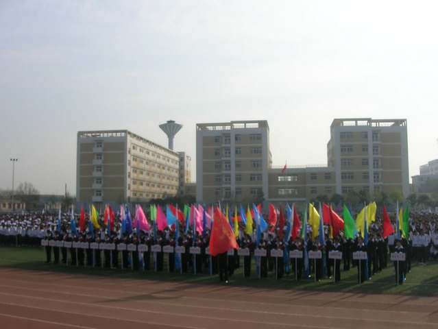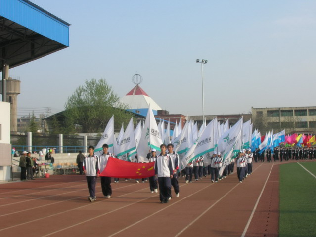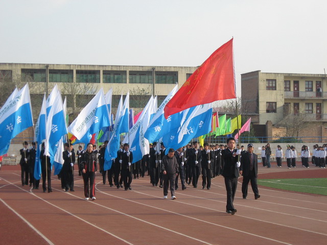 8日上午8时整,在明媚的春光和悠扬的进行曲中,运动会拉开了序幕。首先进行的是入场式,主持人一声令下,仪仗队、会计系、信息工程系、财税系、工商管理系等数十个运动方队相继进入运动场。各系代表队举着系旗,负责人亲自带队入场,并在国歌声中举行了升国旗仪式。