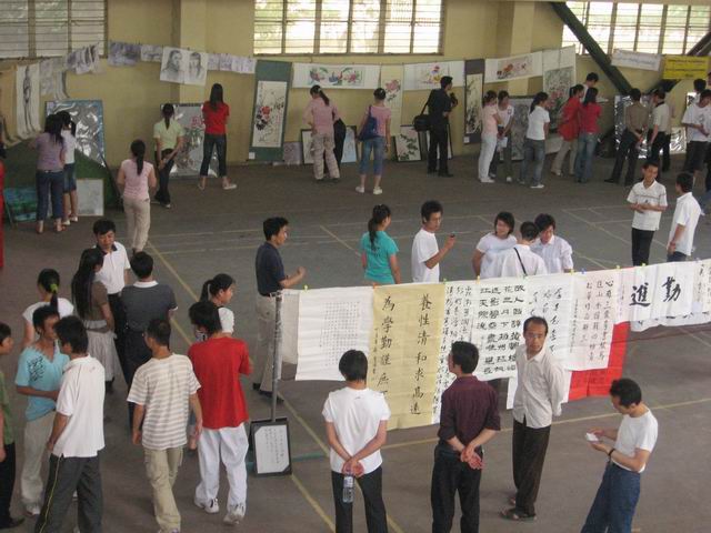 4:50,领导来宾和同学们来到风雨操场,在工作人员的陪同下参观书画汇展,大家一边欣赏,一边交流。遇到优秀作品,更是兴致勃勃,赞赏有加,共同分享者书画汇展的成果和展室的和谐氛围。