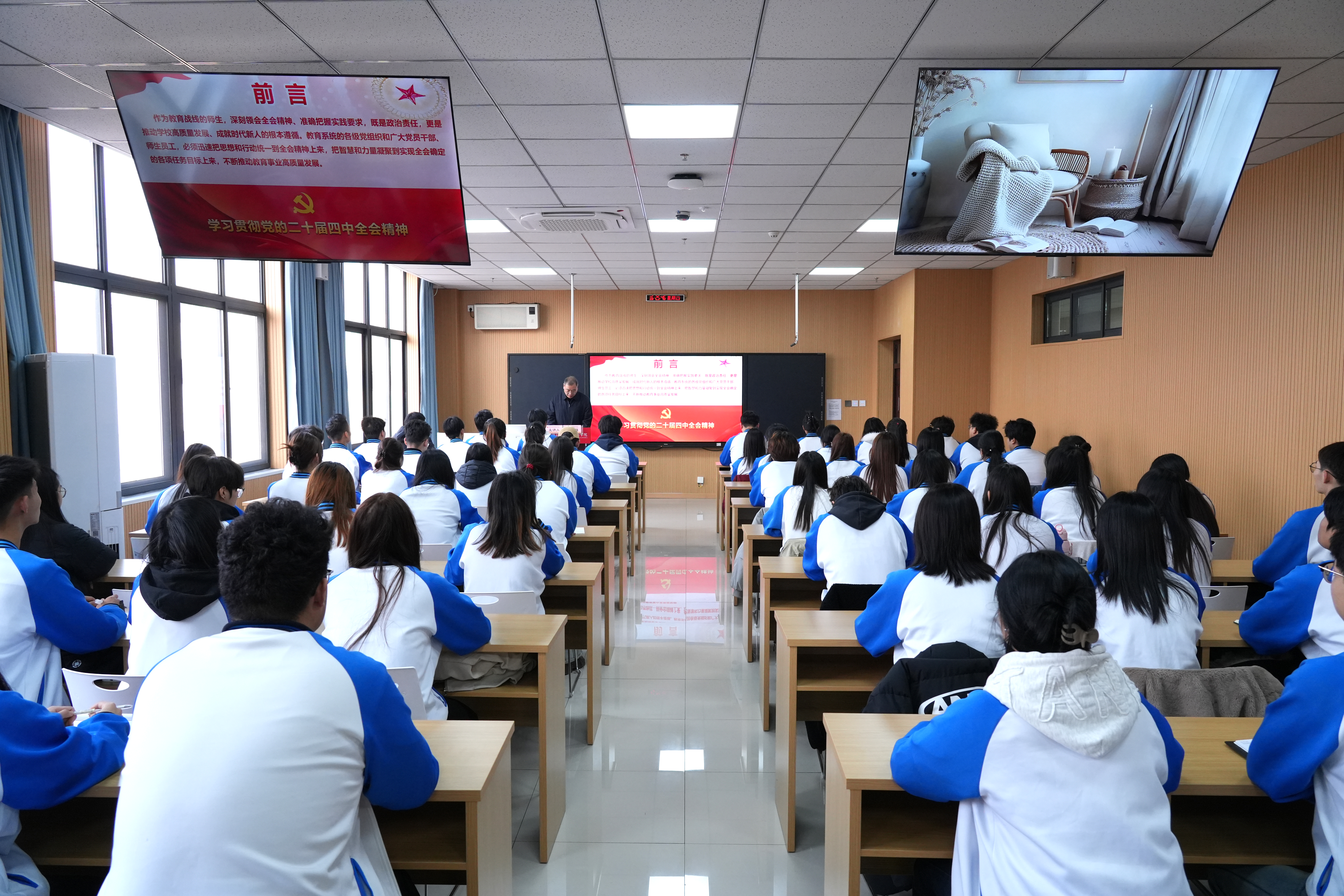 为深入学习贯彻党的二十届四中全会精神,推动全会精神在师生群体中入脑入心、见行见效,12月11日下午,校长程书强教授在综合楼804智慧教室,以《学习贯彻党的二十届四中全会精神 争做担当民族复兴大任的时代新人》为题,面向学生校长助理团、学生会、宿管会学生代表以及有关部门教师代表共计120余人,开展党的二十届四中全会精神宣讲。