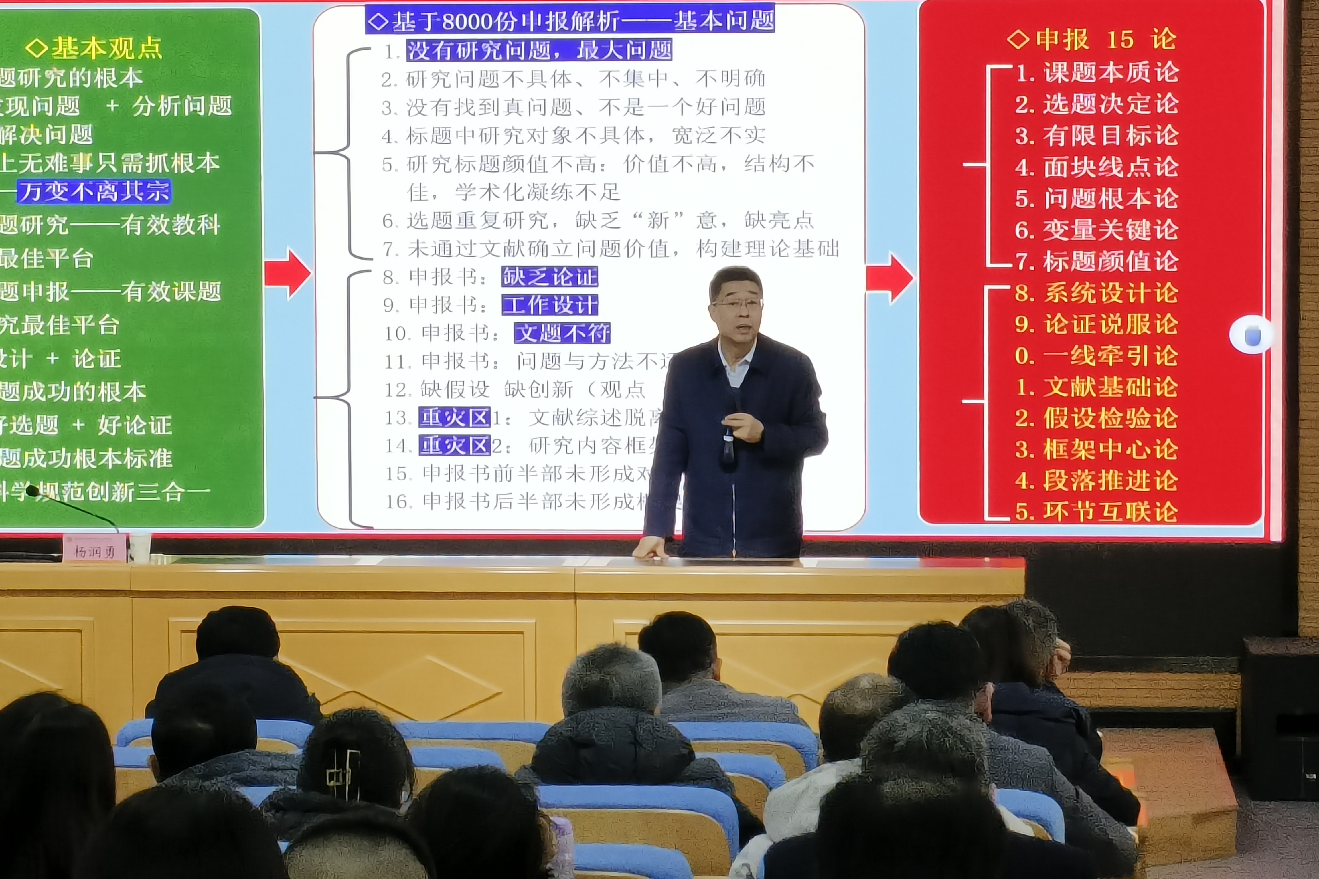随后,杨润勇教授围绕“高水平科研项目申报的关键要素与技巧”这一核心主题展开分享。他结合自身多年科研经验,从研究最好的问题开始,强调最好的问题就是要具备“真存在”、”价值大”、”我能做”三方面。随后他从“课题本质论、选题决定论、面块线点论、问题根本论、变量关键论和标题颜值论等方面结合具体案例进行了系统阐述。同时他还给在坐的各位老师布置了作业,希望大家多了解《教育强国建设规划纲要(2024年-2035年)》《数字中国建设整体布局和规划》等国家政策文件,同时多阅读文献,从文献研究中总结选题,从而更好的开展研究。