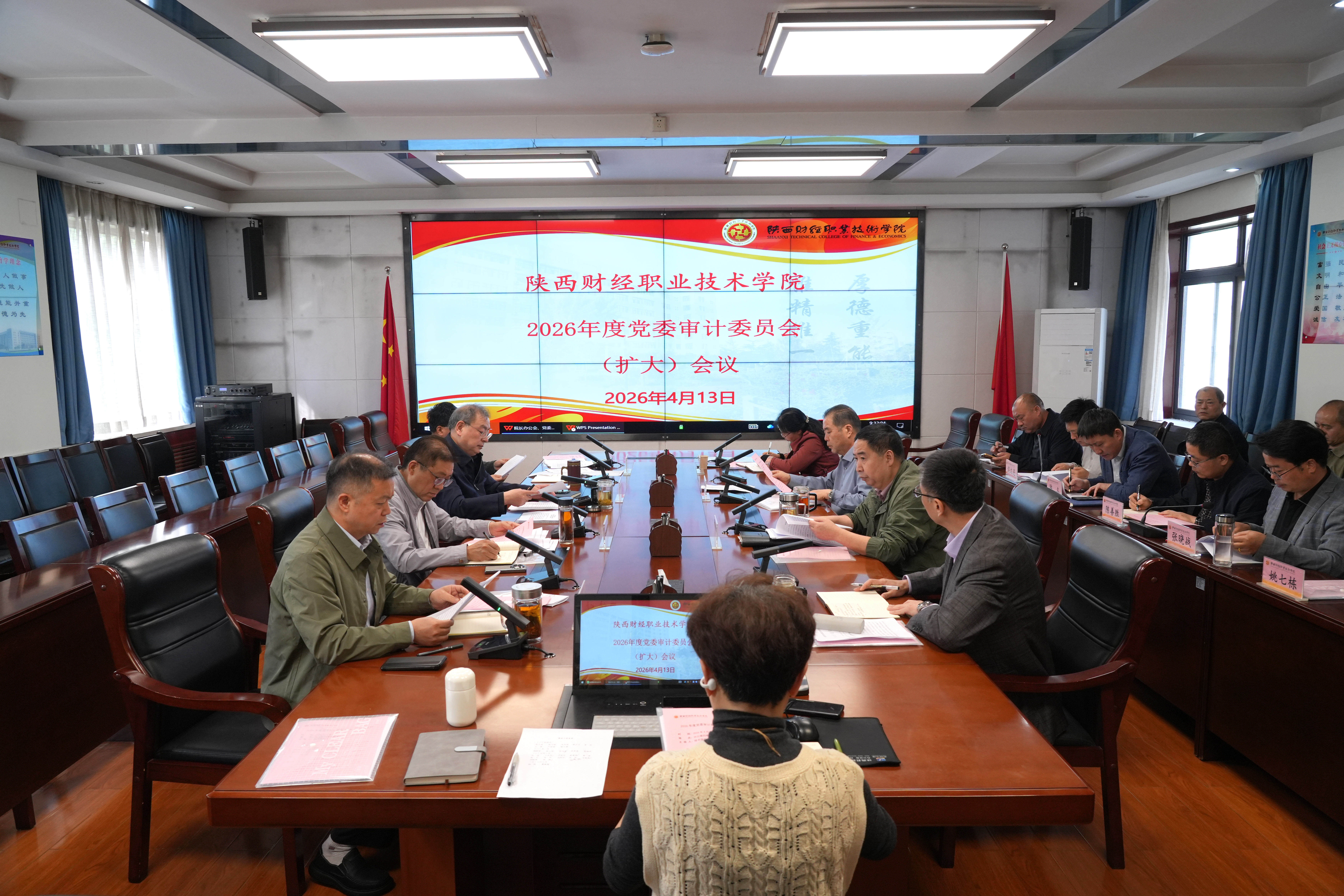 4月13日上午,陕西财经职业技术学院2026年度党委审计委员会(扩大)会议在办公楼四楼会议室召开。会议由校长程书强主持,党委书记高玉峰作重要讲话,党委审计委员会委员及相关部门负责人参加会议。