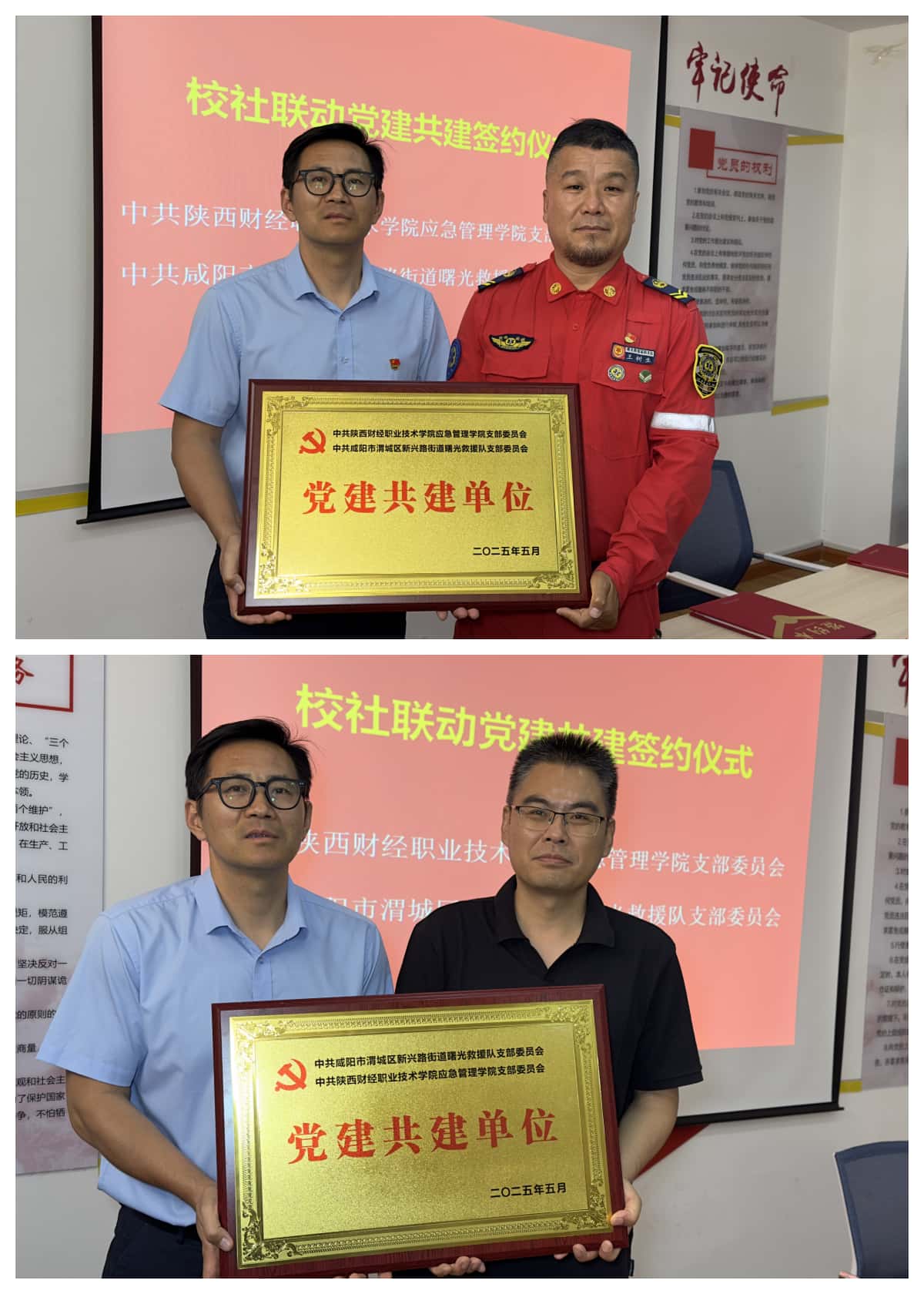 5月29日,陕西财经职业技术学院应急管理学院党支部副书记王华一行6人赴咸阳市渭城区新兴路街道曙光救援队,与曙光救援队党支部共话党建共建事宜,举行支部共建签约暨授牌仪式。咸阳市渭城区曙光救援队队长、党支部书记王树生、党支部纪检书记殷永军、工会主席李立仁、妇联主任薛强利、培训部部长商利、培训部委员冯江涛、新兴路街道党工委副书记王伟伟出席,签约仪式由曙光救援队党支部宣传委员殷选义主持。