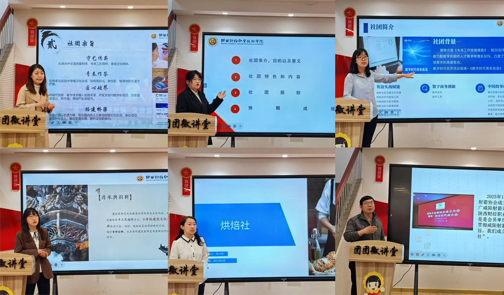丝路经纬非遗社秉承“守艺·创新·共生”理念,通过研习传统技艺、活化手工创作,让千年文脉在指尖流转中焕发新生;“五史”研习社希望激发青年对红色文化的兴趣,为中华民族伟大复兴的中国梦注入青春动能;职场英语达人社致力于帮助成员突破传统英语学习局限,掌握数字时代商务场景的核心技能;筑艺工坊旨在通过有趣和丰富的活动内容,为热爱建筑装饰艺术与手工艺制作的同学提供展示、交流与实践的平台;烘焙社鼓励成员大胆创新,尝试新食材与做法,培养创新思维,让古老的美食文化在现代社会得以延续与发展;射艺学社希望进一步推广射箭运动和文化,让对射箭感兴趣、喜欢射箭的人,有机会体会到射箭的乐趣。