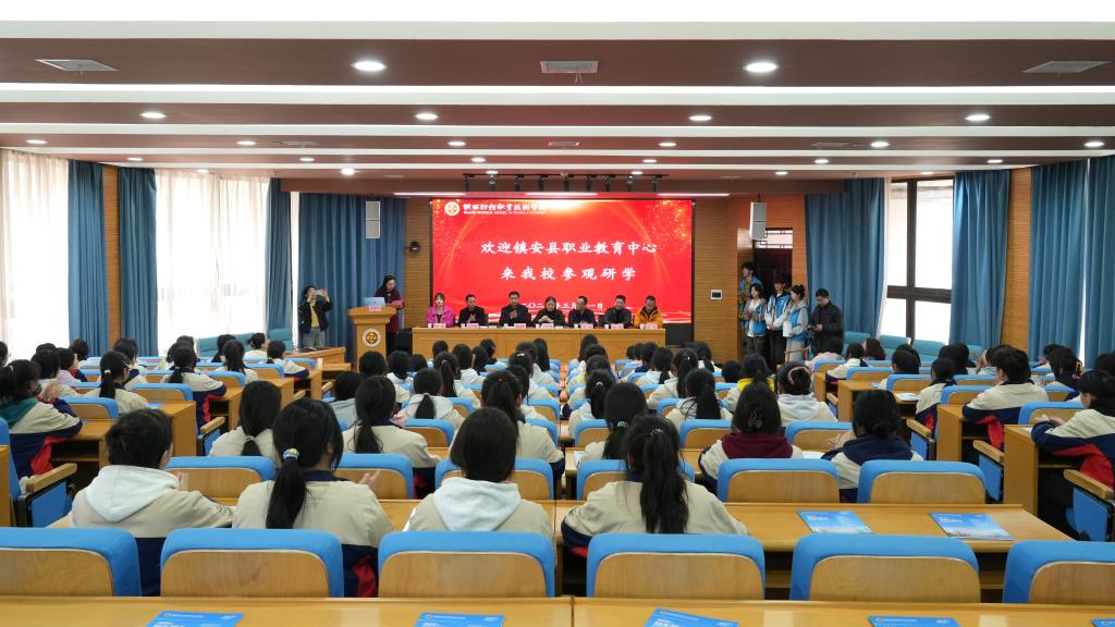 在欢迎仪式上,付世秋代表学校对研学团的到来表示热烈欢迎,并介绍了我校的办学特色、专业设置、师资建设以及近年的突出成果。瑚成群对我校师生的热情接待表示真诚感谢,并对镇安职教中心的办学情况进行了介绍,对我校显著的办学成果高度认可,期待与我校在专业共建上有进一步的合作。