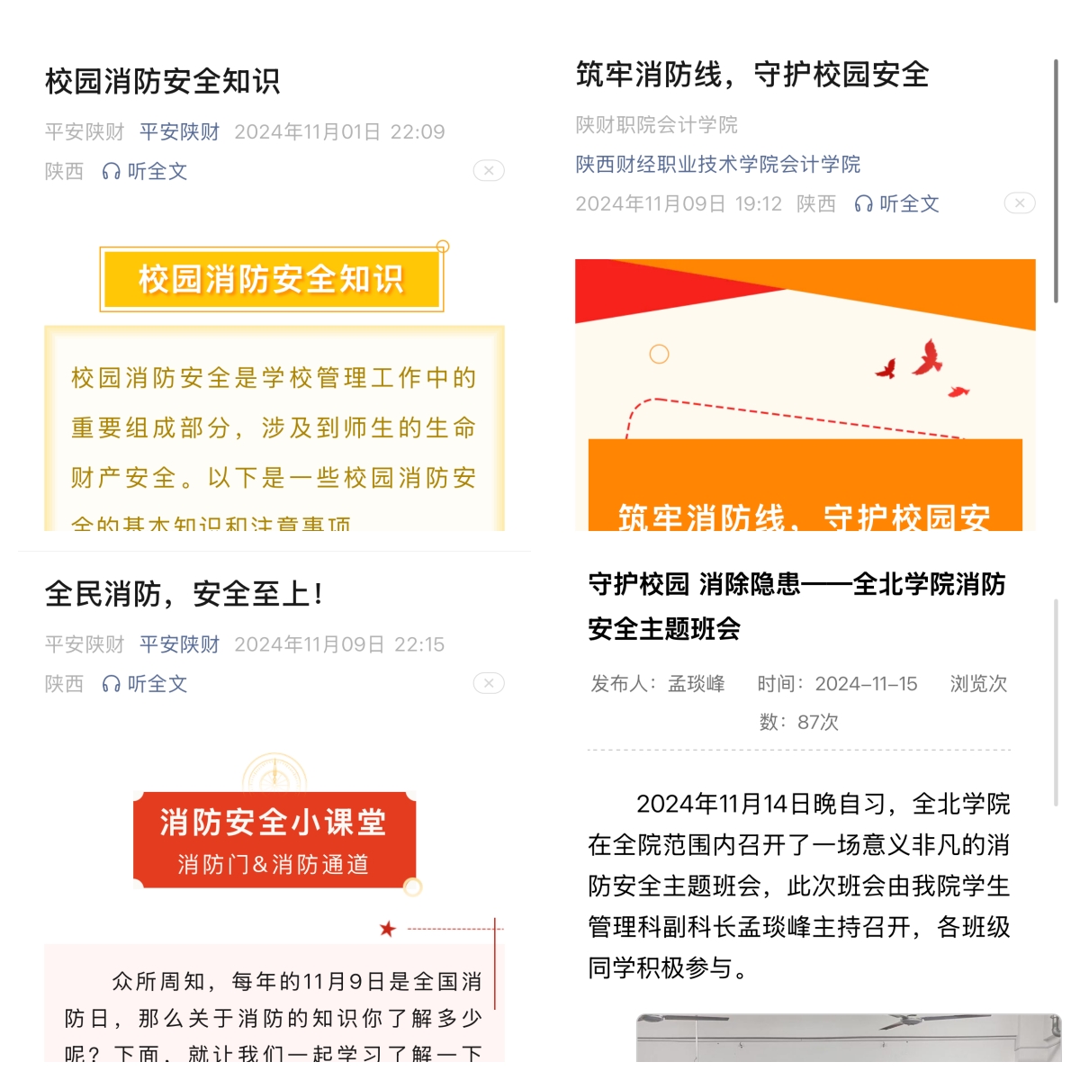 二是广泛宣传、加强学习。学校各二级学院、各部门充分利用主题班会、微信公众号推文,调查问卷、宣传单和电子显示屏等载体,宣传普及消防知识,内容涵盖火灾诱导因素、危害,初期火灾的扑救方法、消防通道的重要性以及火场逃生技巧等多个方面,剖析日常教学及管理工作中容易被忽视的消防安全细节,引导师生员工主动争做校园消防安全的宣传者和实践者,为营造安全和谐的校园环境贡献力量。