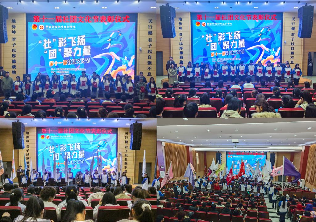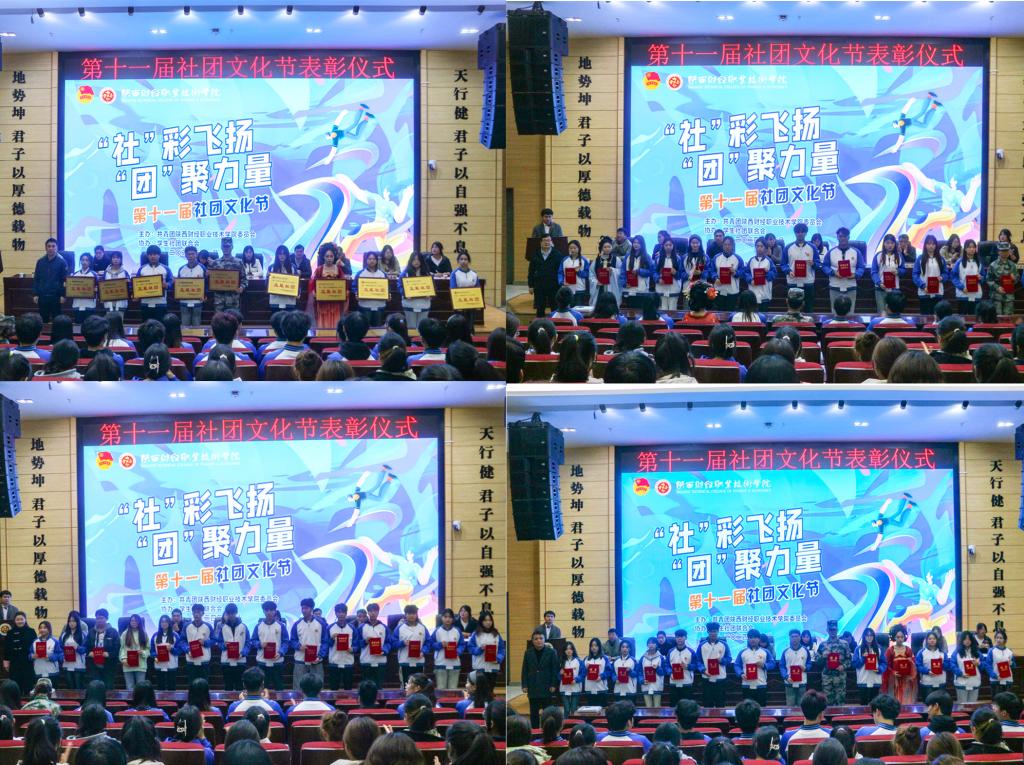 会计学院团委书记张璐、大数据与人工智能学院团委书记谢卫朋、数字商务学院团委副书记张欣瑞分别为获奖学生颁发了荣誉证书;人文艺术学院团委书记刘明、全北学院学生管理科副科长孟琰峰、运动与健康管理学院团组织负责人李嘉璐为社团新聘社长颁发了聘书。团委办公室主任连静为九嵕茶社、翰墨轩书画社、子衿汉服社等60个社团现场授旗。