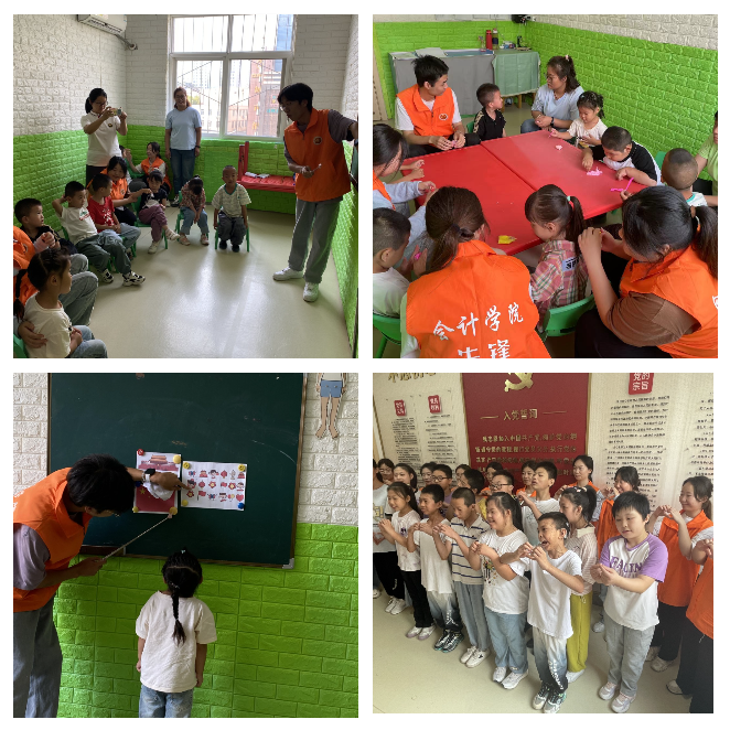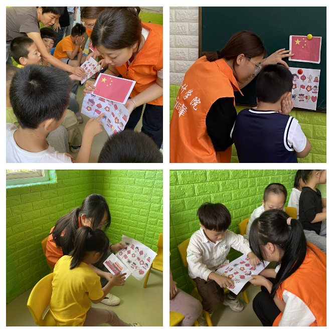 “先锋橙”志愿者根据原计划分为两组,对于不同“情况”的儿童开展“国庆小课堂”“环保小讲堂”活动。在“国庆小课堂”中,志愿者以游戏为主,以“手工捏泥”游戏为辅,同时加入关于国旗、天安门以及其他爱国主义元素,让特殊儿童在轻松愉快的氛围中提升认知能力,进一步增强爱国主义精神;在“环保小课堂”中,志愿者围绕“今天天气为什么灰蒙蒙的”展开讲解,为特殊儿童普及了环保知识,让他们明白环保的重要性。