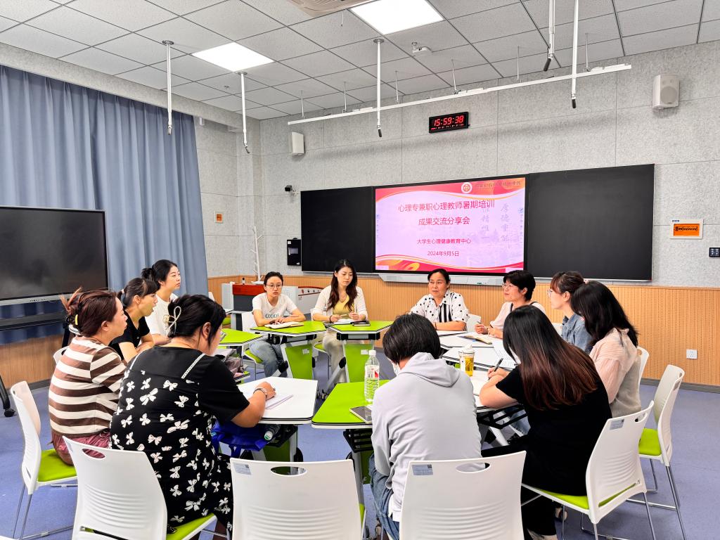 为进一步提升我校心理教师的专业素养与业务能力,通过教师培训成果的分享来启迪思维、激发潜能、促进实践,我校于2024年9月5日在教学楼816智慧教室举办心理专兼职教师暑期培训成果交流分享会。大学生心理健康教育中心主任杨欢欢主持会议,全体专兼职心理健康教师参会。