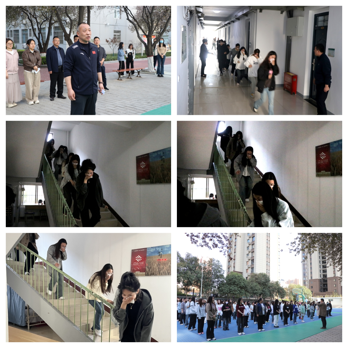 演练正式开始,模拟学生公寓某寝室突发火灾,公寓管理员第一时间发现险情,立刻吹响口哨,指挥学生用湿毛巾、湿手帕等捂住口鼻,弯腰低头、靠右有序快速从宿舍东西两侧通道撤离到疏散集结点。各宿舍长迅速清点人数,并汇报给演练总指挥。在短短的2分钟内,全体学生安全疏散完毕。
