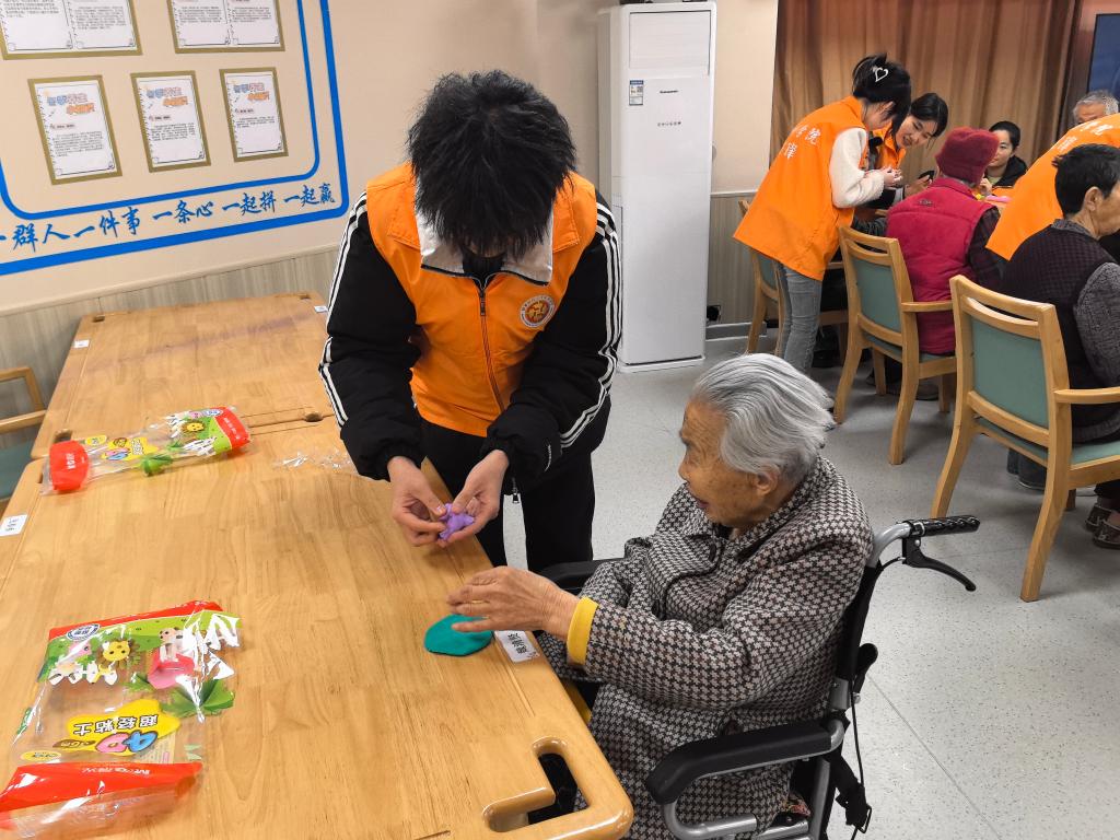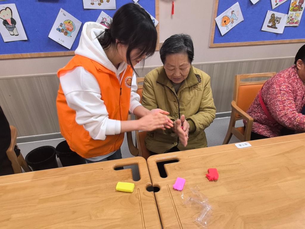 活动伊始,志愿者们老人们亲切交谈,询问老人们的饮食起居与身体健康情况,并叮嘱老人们要多注意身体。认真倾听老人们讲述曾经的故事,通过缅怀往事,增强他们对生活的信心,鼓励他们互相支持和帮助。接着,志愿者们手把手教老人们用粘土制作各种各样精美的手工制品,他们详细讲解每个步骤与方法。在志愿者的帮助下,老人们慢慢地通过揉、捏、搓、贴等动作,努力发挥想象力捏出玫瑰、太阳花、熊、饺子、小猪等一系列有创意的小物品。随后,志愿者与老人们一起唱戏曲、忆往昔、唱红歌,做表演,谈未来,不仅勾起了老人们的珍贵回忆,也让志愿者们更加深刻地体会到了陪伴和传承在新时代的价值和意义。