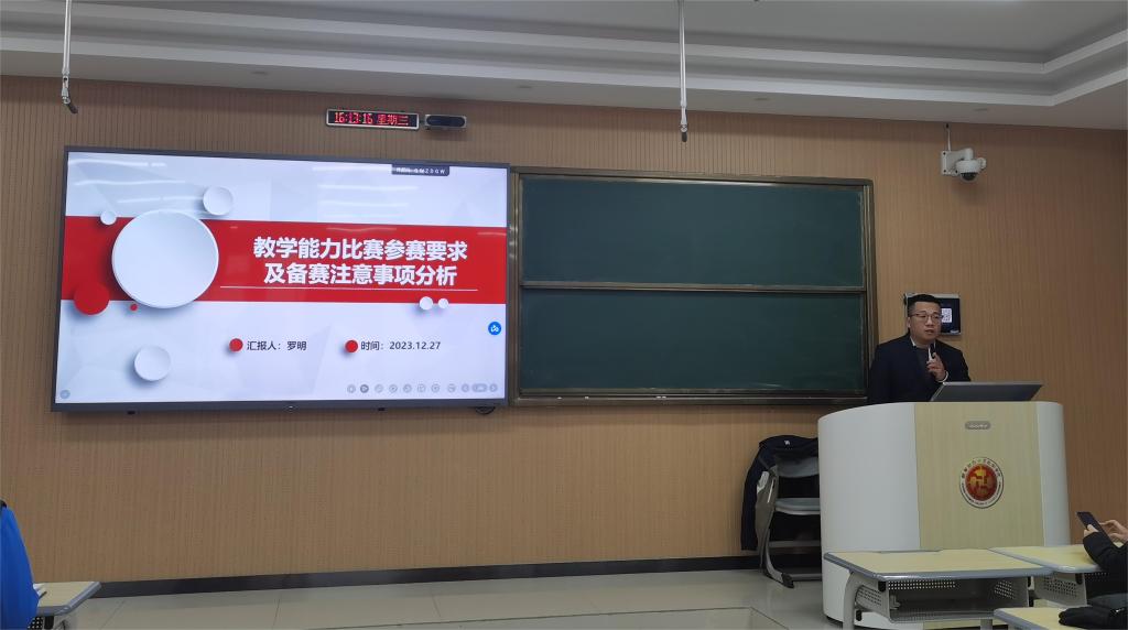 2023年12月27日下午,我校邀请全国职业院校技能大赛教学能力比赛一等奖获得者罗明副教授作“教学能力提升及备赛指导”专题培训讲座。此次培训旨在为教师们提供2024年技能大赛的备赛策略,助力教师们在教学与比赛中迈向更高层次。讲座在综合楼112教室举办,由教务处副处长李福顺主持。