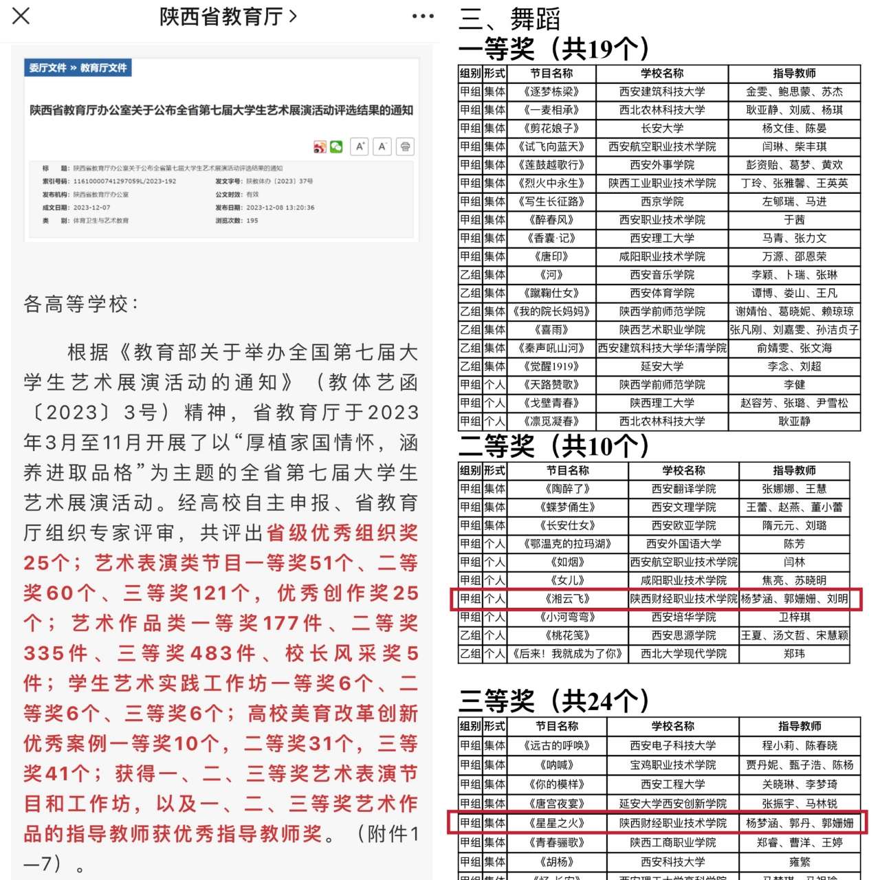 近日,陕西省教育厅发布了《陕西省教育厅办公室关于公布全省第七届大学生艺术展演活动评选结果的通知》,人文艺术学院师生在全省第七届大学生艺术展演活动中,荣获艺术表演类节目二等奖1个、三等奖3个。