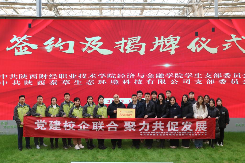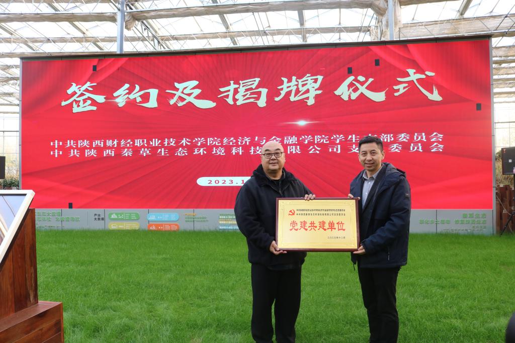 为进一步推动学习贯彻习近平新时代中国特色社会主义思想主题教育,切实提高党建质量和水平,打造校企共建品牌特色,推动实现“优势互补、资源共享、取长补短、共同提高”的党建工作新格局,2023年12月1日,经济与金融学院学生党支部与陕西秦草生态环境科技有限公司党支部在秦草生态科研基地举行党建共建签约揭牌仪式。经金学院学生党支部书记张力,秦草党支部副书记刘茂林,双方支部全体支委成员,部分学生党员代表参会。