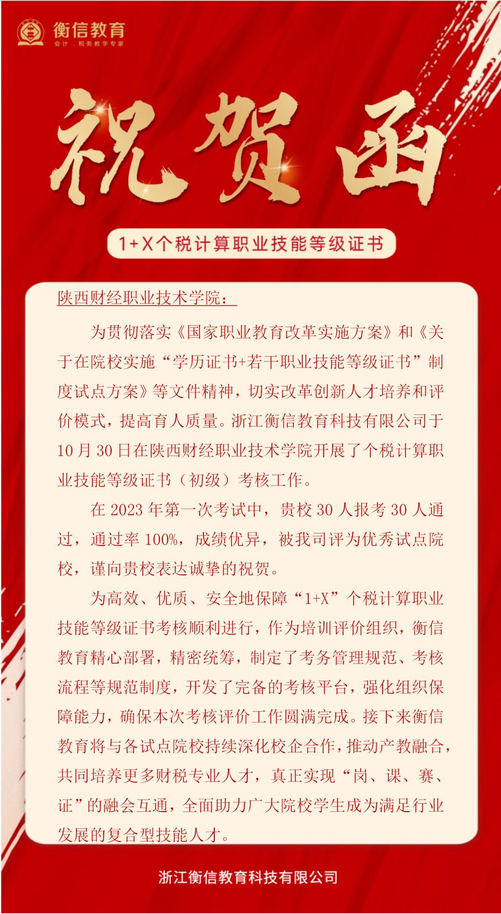 为进一步贯彻落实《国家职业教育改革实施方案》和《关于在院校实施“学历证书+若干职业技能等级证书”制度试点方案》等文件精神,切实改革创新人才培养和评价模式,提高育人质量,会计学院分别于2023年10月30日和11月30日在我校智税云财实训中心组织2022级大数据与会计专业、大数据与财务管理专业学生参加了个税计算职业技能等级证书初级和中级全国统一考试。日前接到喜报,初级、中级考试通过率均达到了100%。