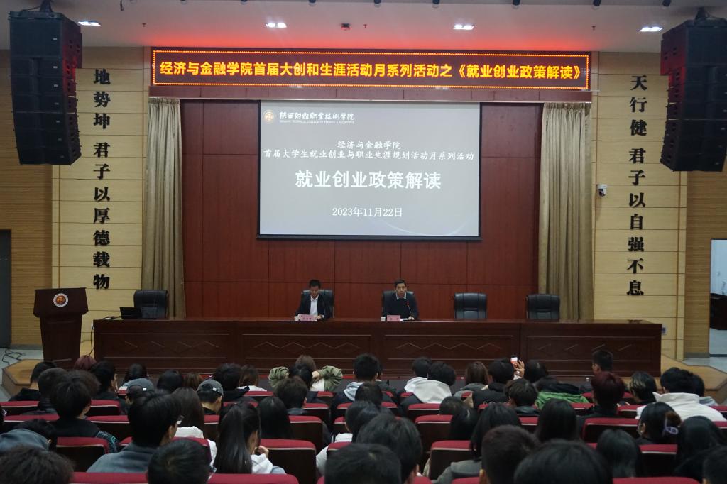 为进一步落实立德树人根本任务,推动我院“大思政课”建设,在注重理论与实践相结合的基础上,探索善用“大思政课”创新育人格局,打造融思政课与实践性于一体的“实践+思政”育人体系。让学生深入了解社会现实,增强社会责任感和实践能力,帮助学生提升就业和创业技能,做好职业规划和就业准备,根据经济与金融学院“首届大学生就业创业与职业生涯规划活动月”安排,11月22日晚,经金学院特别邀请“经金就业创业联盟”校外导师、咸阳市秦都区人力资源和社会保障局就业科科长张海峰先生来校做《大学生就业创业政策解读》专题讲座。经金学院专职副书记张力、学生管理科副科长韩少兵及400余名学生代表参加讲座。
