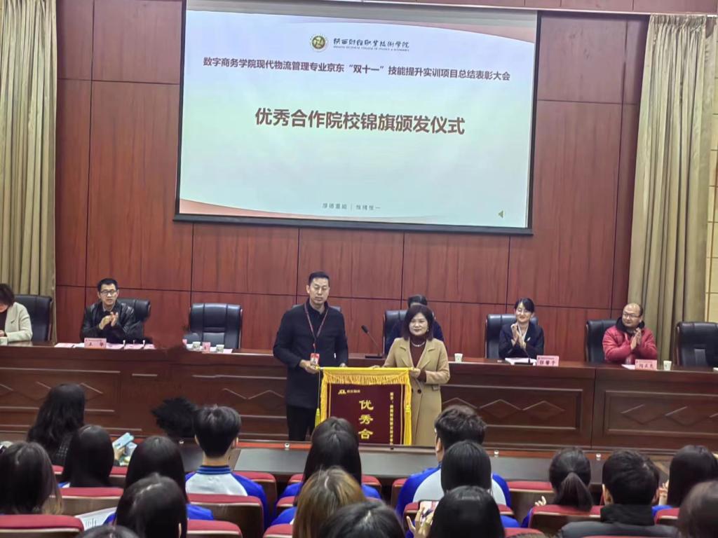 在此次实训中,我院3名老师获得“优秀指导教师”,10名学生获得“绿色就业通道”,36名学生获得“优秀实习生”。数字商务学院院领导、企业领导为获奖教师及学生颁发证书及奖品。白光泽代表京东集团向我院颁发优秀合作院校锦旗,董媛代表我院接受锦旗。优秀学生代表张坛飓表示此次实训是他职业生涯的重要起点,他将不断积累经验,为更好地融入社会做准备。