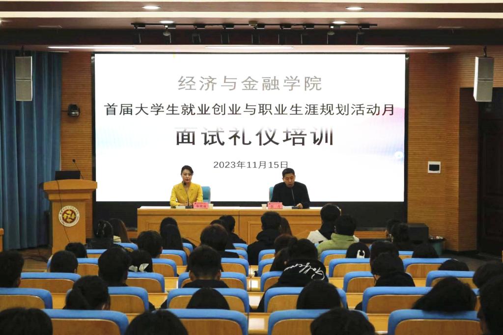 为助力大学生职业生涯规划大赛,提高学生就业能力,增强学生求职面试技能,根据我院首届大学生就业创业和职业生涯规划活动月安排,11月15日晚,经济与金融学院特邀“经金就创联盟”校外导师、资深商务主持人、国家注册高级形象礼仪培训师张艳丽在继续教育报告厅举办面试礼仪专题培训会。