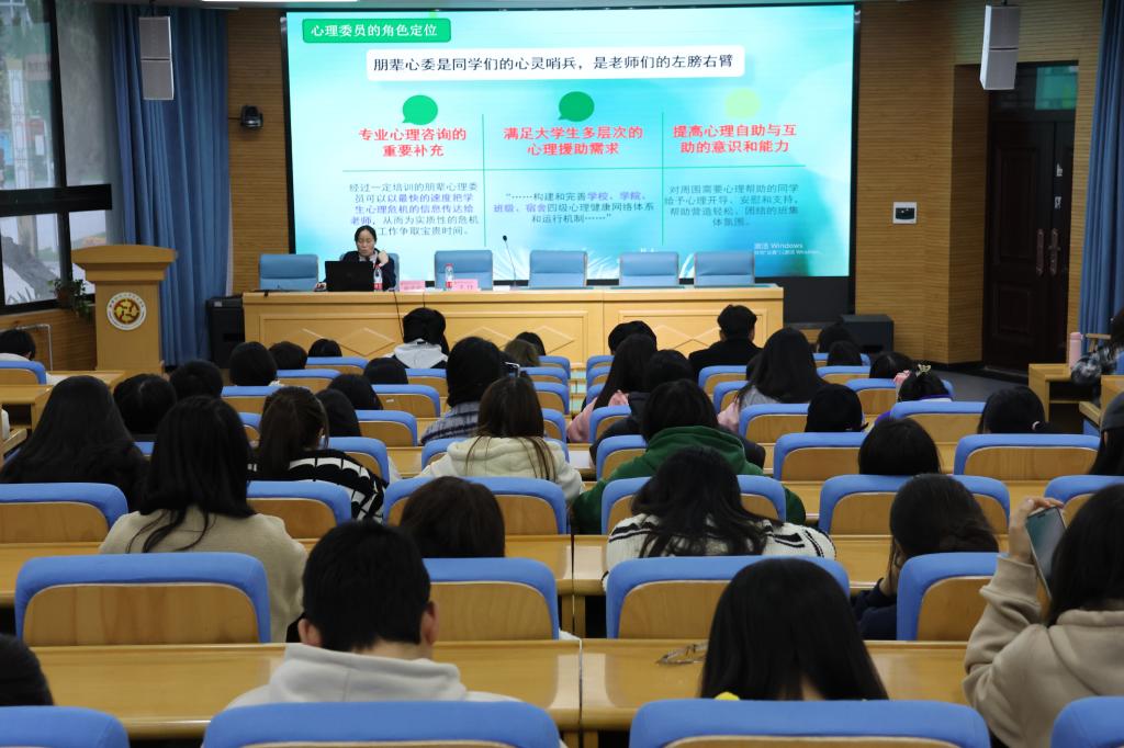 ——心理委员培训,抓住朋辈关怀中坚力量。11月7日下午,在继续教育培训厅,学生处大学生心理健康教育中心主任杨欢欢给2023级127名心理委员进行了培训。杨欢欢介绍了大学生心理健康教育中心的基本情况,讲解了心理工作的原则与态度、职责与内容、方法与技巧,她指出心理委员是朋辈关怀的中坚力量,她要求全体心理委员要充分发挥好桥梁纽带作用,当好心理健康的观察者、倾听者、陪伴者、引领者和护航者。