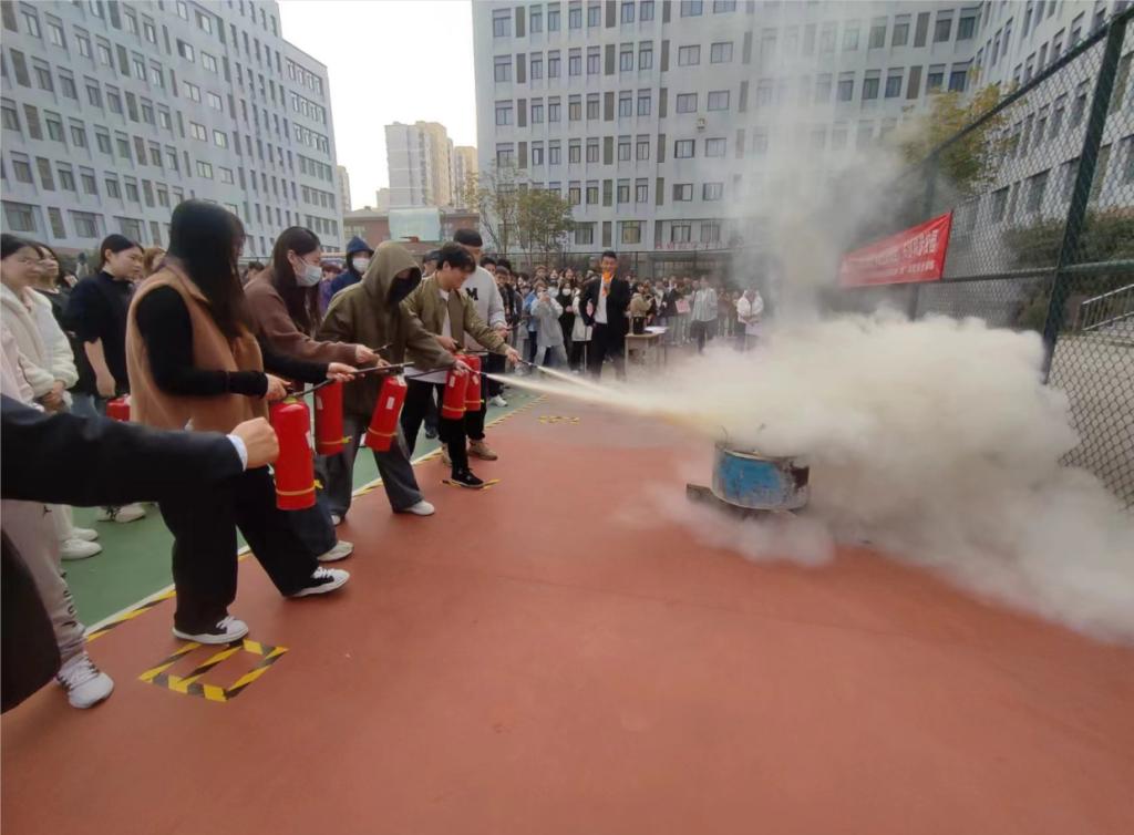 演练结束后,咸阳新控物业有限公司工程师王红战给全体师生进行了消防安全知识培训。他详细地为师生讲解消防安全知识及火灾突发的应对措施和消防设备使用方法,着重强调了安全工作的重要性及公寓安全应注意的问题。给学生讲解了灭火器的使用方法并进行了现场演示。部分教师和学生在安保人员现场指导下进行了灭火器灭火演练。