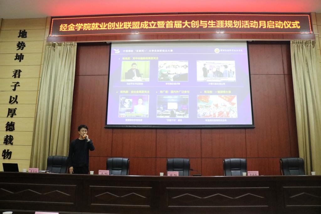 在学术报告厅经济与金融学院的“经金就业创业联盟”成立暨首届“大创与生涯规划活动月启动仪式上,学生工作处副处长王刚作为首批聘任的校内就业创业导师、创新创业省赛评委为参会师生作了职教赛道专题解读。
