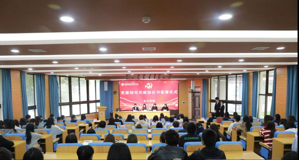 签约仪式在庄严的国歌声中拉开序幕,全体起立,奏唱国歌。由党总支宣传委员刘金鹿宣读会计学院教师党支部和学生党支部结对共建活动实施方案。接下来,六个教师党支部负责任人分别与六个学生党支部负责人签署党建结对共建协议书,表示今后将通过活动共办、组织共建、信息共享等方式,开展党建共建活动。李妙娟表示各支部要做好对接、严格落实,要加强与支部间的学习交流,不断拓展合作的广度与深度,做到资源共享、业务共融,搭建起服务师生的良好桥梁,持续开展内容丰富、形式多样的主题党日活动。