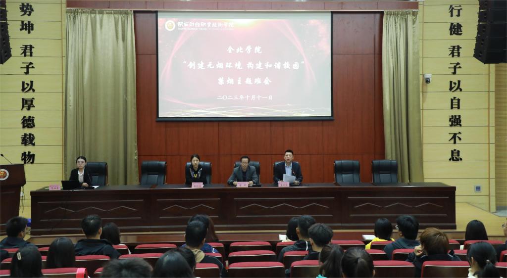 为强化学生的控烟、禁烟意识,加强学校禁烟控烟工作,扎实推进无烟校园建设,引导全北学院全体学生自觉规范遵守校内禁烟规定,培养和树立文明、健康、科学的生活方式,10月12日晚,全北学院在学术报告厅和各班级晚自习教室开展了“创建无烟环境,构建和谐校园”禁烟主题班会。全北学院党支部书记兼副院长雷剑、学生管理科副科长孟琰峰、23全会计1班班主任张珈瑜、23全会计2班班主任李杰、23全电商1班、23全金融1班班主任陈泽慧及我院全体学生参加了此次班会。会议由孟琰峰主持。