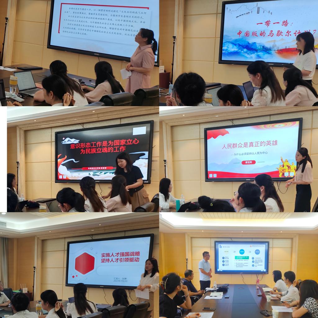 7月2日,马克思主义学院在实训中心二楼会议室举行了2023年思政课教师“大练兵”说课活动。全体思政课专兼职教师参加了此次展示。马克思主义学院副院长殷蓬勃、省级教学标兵概论教研室主任郭金梅、省级教学标兵思想道德与法治教研室主任丁静参加观摩点评。