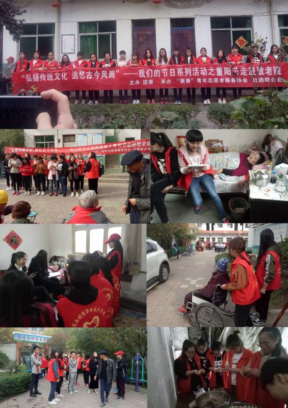 10月28日,我院社团联合会与“聚善”青年志愿者服务协会的20名志愿者组织了“弘扬传统文化追忆古今风尚”—我们的节日之重阳节献爱心活动。